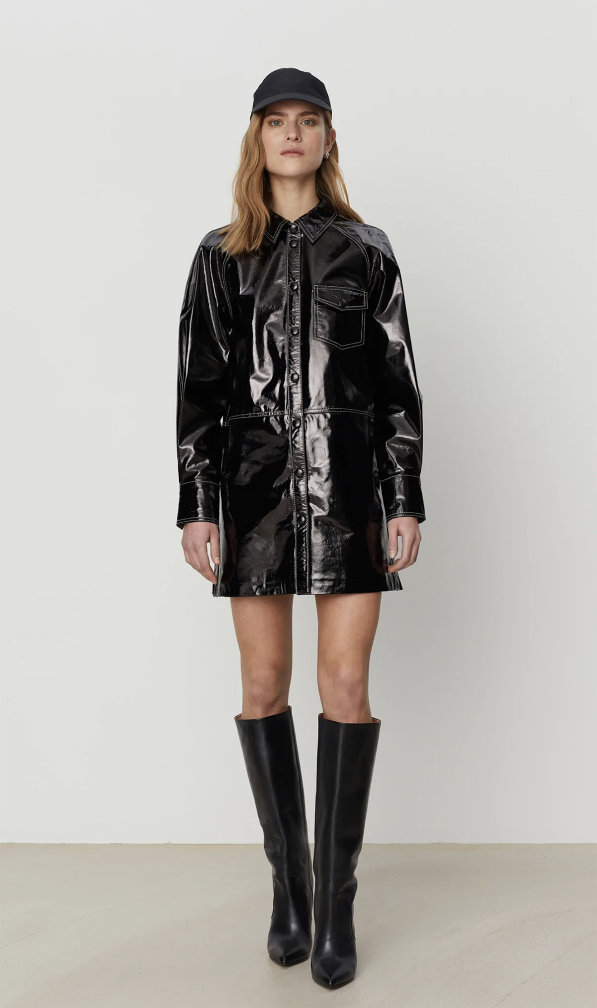 Cette chemise en cuir verni présente une silhouette longue, des fermetures à boutons-pression et une poche plaquée à l’avant. Portez-le ouvert sur un jean et un t-shirt pour un look minimaliste et moderne.