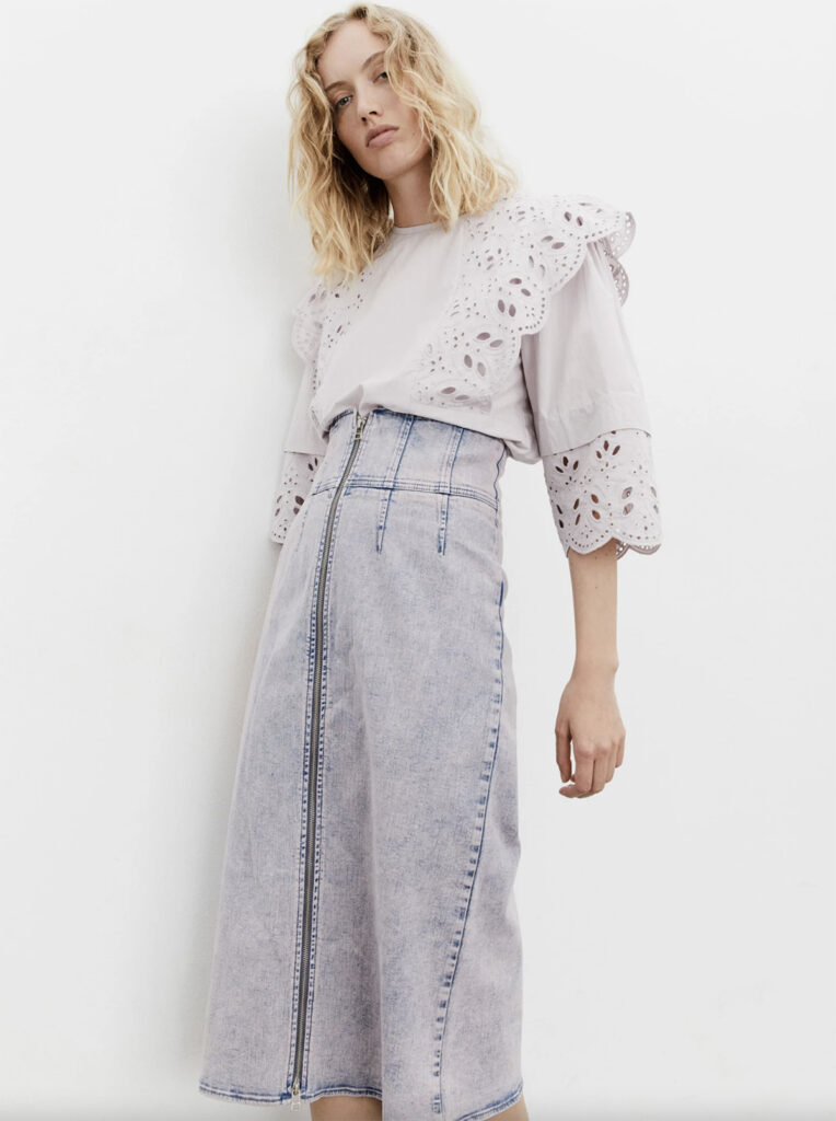 Un haut ample et impeccable avec des volants en Broderie Anglaise sur les épaules et sur les manches. Le haut est doté de manches trois-quarts et d’une fermeture à boutons avec une ouverture en trou de serrure dans le dos. À porter avec une jupe trapèze pour un look sophistiqué. 100% coton.