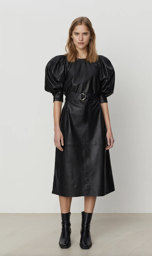 Une robe en cuir de longueur midi avec des manches courtes bouffantes, une ceinture à boucle en D à la taille et une fermeture éclair à l’arrière. La robe est entièrement doublée.