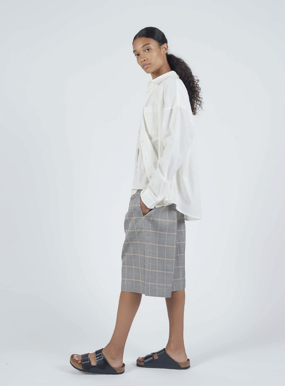 Short bouffant décontracté dans un plaid drapé en laine de viscose. Ce short repose carrément sur la hanche basse avec une taille avant décontractée et arrive juste en dessous du genou. Poches sur les coutures latérales, poches arrière passepoilées. Fermeture à bouton et à glissière avec passants de ceinture à la taille.