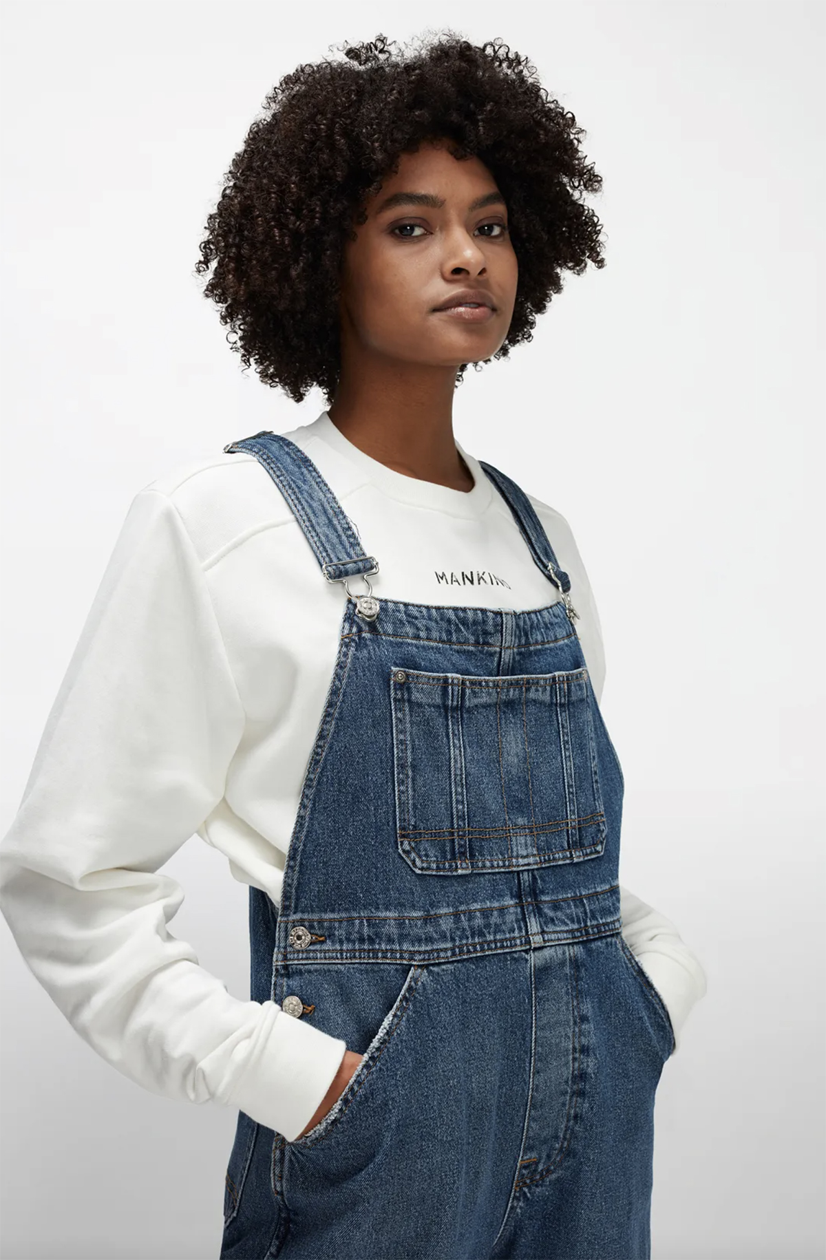 En denim bleu moyen, la salopette s’adapte parfaitement à une multitude de tenues : choisissez un T-shirt à manches longues et des sneakers pour un look gagnant.
