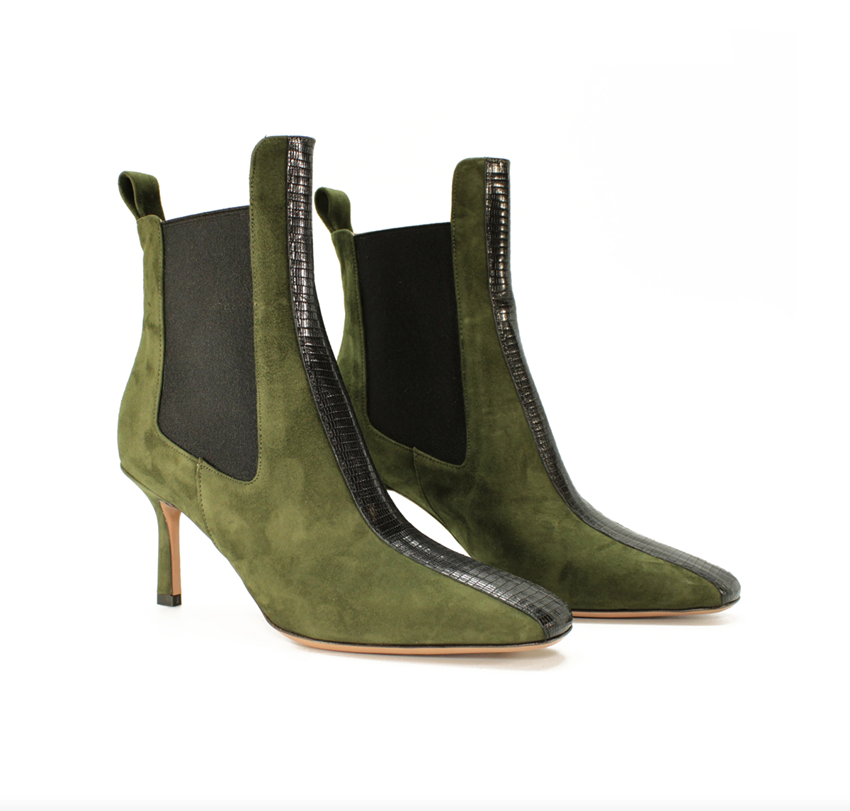 Bottine féminine avec élastique sur le côté, en daim couleur pin. Bande centrale contrastée en cuir de veau imprimé noir.