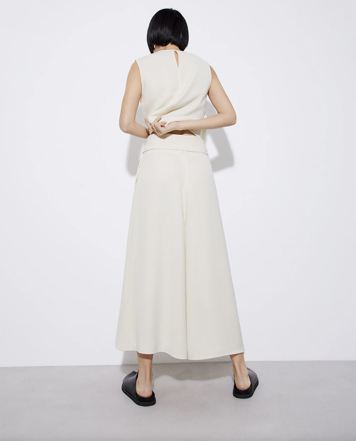 Pantalon palazzo en polyester recyclé. Coupe fluide. Taille élastiquée et ceinture longue. Poches dissimulées dans les coutures latérales.
