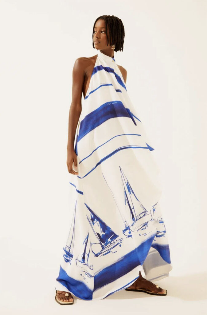 Parfaitement ajustée, cette robe longue au design licou présente des détails uniques tels qu’une fermeture à boutons dorés au niveau du cou et un décolleté plongeant profond dans le dos, ainsi qu’un ourlet asymétrique avec un devant croisé.
