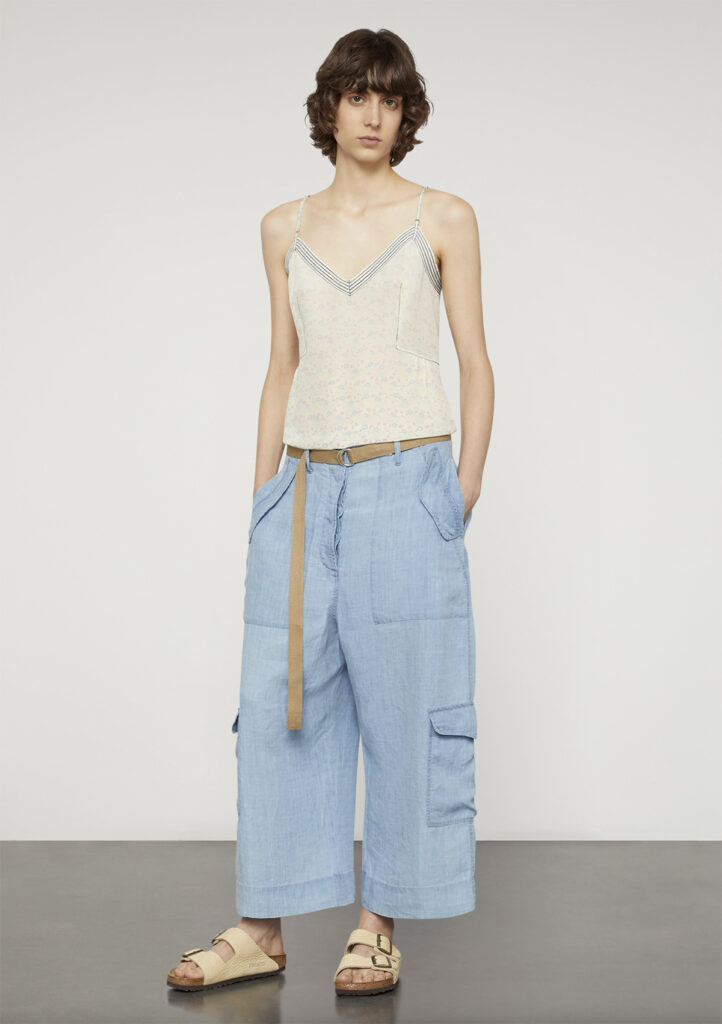 Pantalon en toile de lin délavé. Ceinture avec bouton, braguette avec boutons, poches latérales plaquées. Poches plaquées militaires latérales avec rabats et soufflet, entrée de poche à l’italienne. Poches plaquées avec rabat et bouton sur l’arrière. Jambe large et droite.
