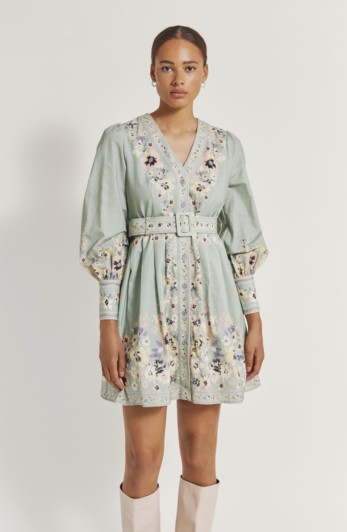 La robe trapèze a une silhouette flatteuse avec la ceinture décorative, le col en V et les bras ballons. Le beau motif pastel rend la robe Valeria unique – elle est élégante et subtile mais très amusante.