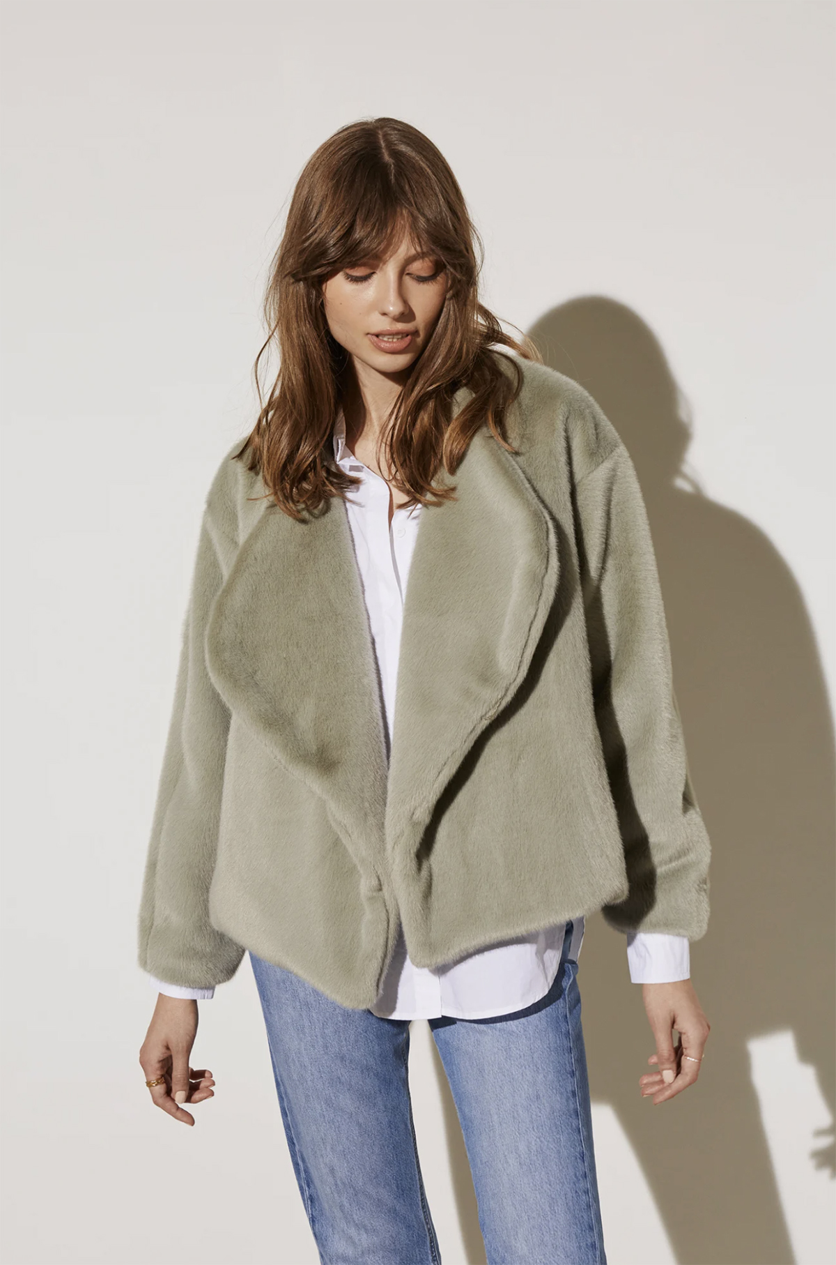 Notre veste en fausse fourrure Zinna est conçue dans une silhouette légèrement ample avec un devant asymétrique et une fermeture enroulée avec un bouton sur la poitrine avec des fermetures dissimulées. La couleur olive irrésistible le rend parfait non seulement pour les dîners élégants, mais aussi pour la journée.