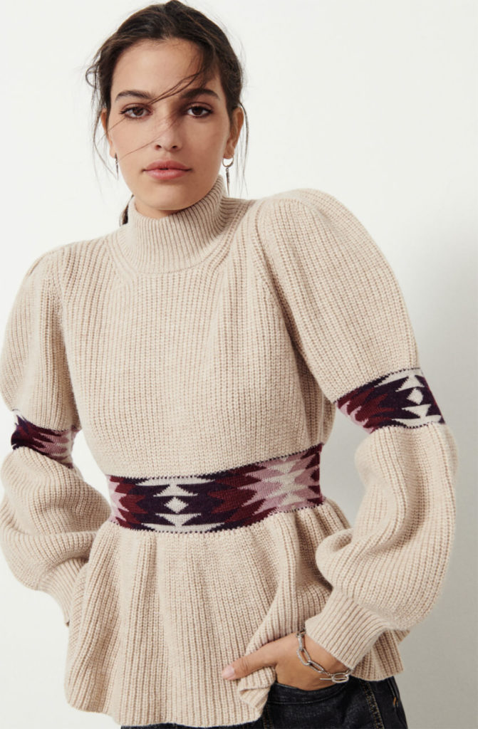 Le pull OCTAVE ba&sh sort du lot, irrésistiblement ! Ce pull à col montant et manches longues se distingue par ses bandes resserrées aux coudes et à la taille, rehaussées de motifs géométriques colorés. Il est confectionné en maille perlée sur le corps et intarsia sur les bandes pour créer un effet de resserrage à la taille, sans serrer, tout en fluidité : un défi technique ! On note le jeu de points façon pinces pour une épaule un peu carrée, de même que la basque et la côte 1×1 en bas de corps. Un joli jeu de volumes pour ce pull féminin qui s’inspire du top à basque pour proposer une version du pull de ski hyper lookée.