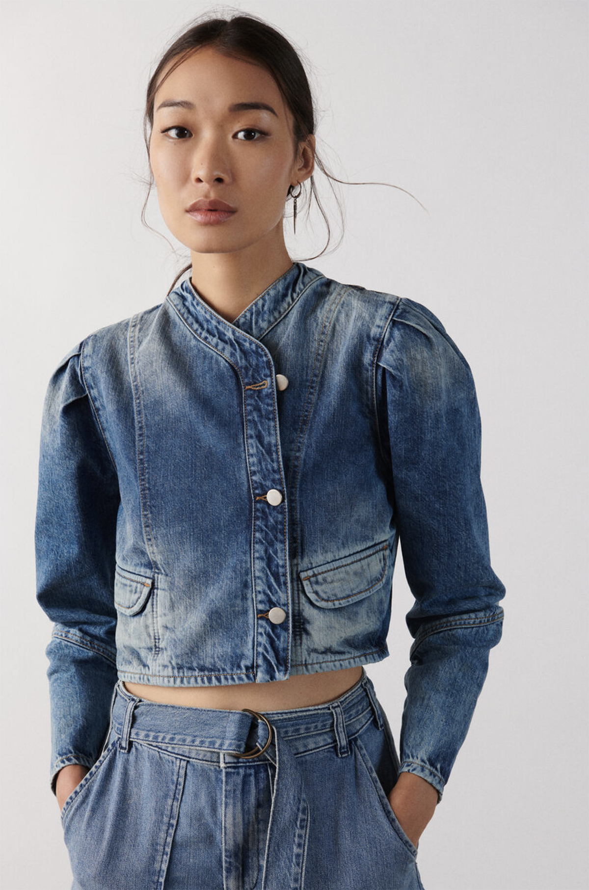 La veste DAISY ba&sh vient enrichir le vestiaire denim de la Maison. Cette veste en jean joue l’audace avec son volume court, ses manches longues plissées aux épaules et plus ajustées sur les avant-bras. On note aussi les découpes surpiquées qui apportent de la structure et les petites poches à rabat arrondi devant. La veste est confectionnée dans un denim délavé pur coton. Le détail mode ? L’ouverture décalée sur un côté, pour apporter de la féminité. Une veste en jean pointue, pour un look qui sort de l’ordinaire.
