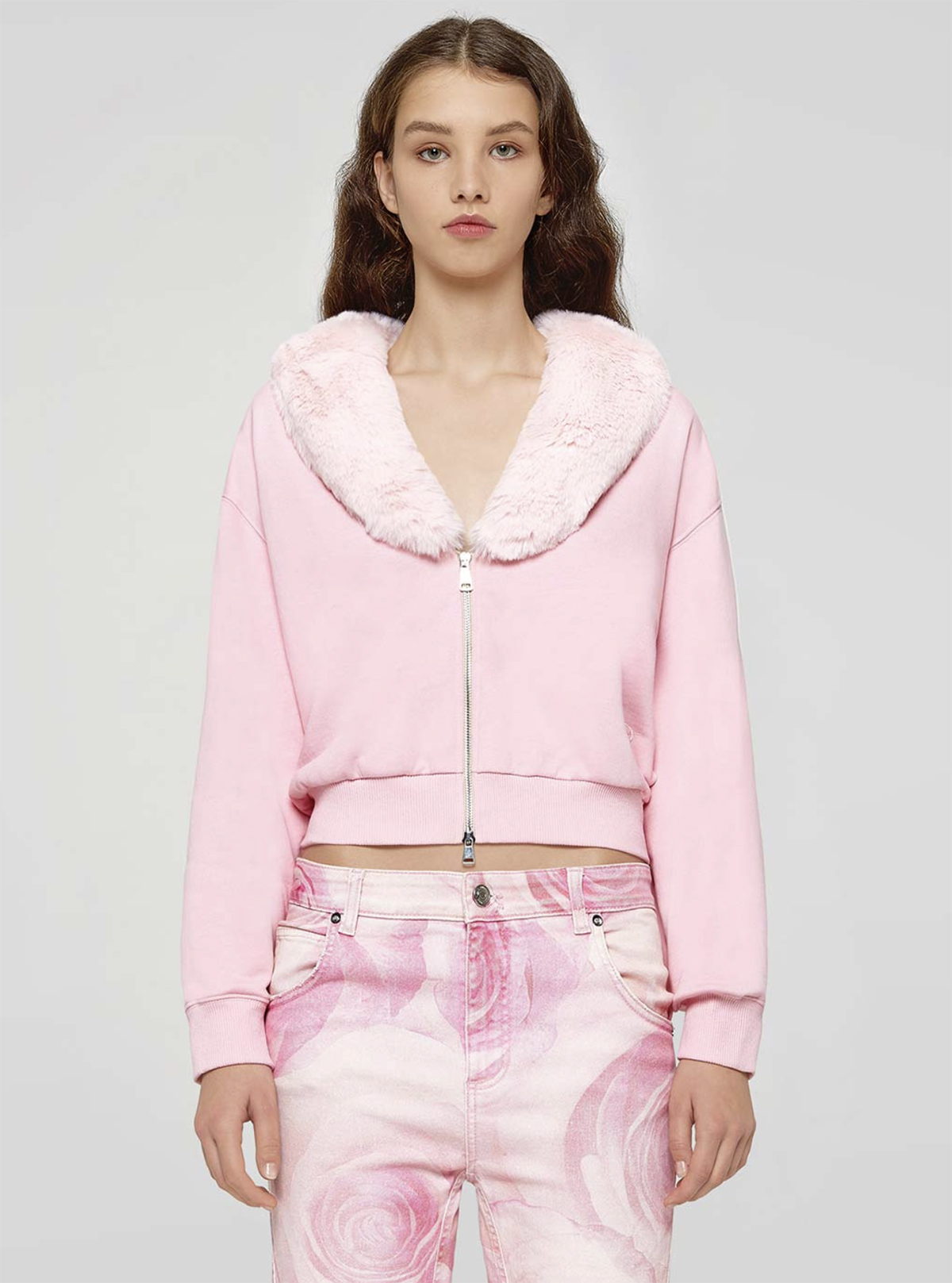 SWEAT-SHIRT EN COTON AVEC PROFILS CONTRASTÉS EN FOURRURE DE VISON ÉCOLOGIQUE À L’ENCOLURE EN V, MANCHES LONGUES, FERMETURE À GLISSIÈRE BIDIRECTIONNELLE, PROFILS CÔTELÉS, LOGO BRODÉ À L’OURLET. COMPOSITION : 100 % COTON. DOUBLURE : 100 % POLYESTER.