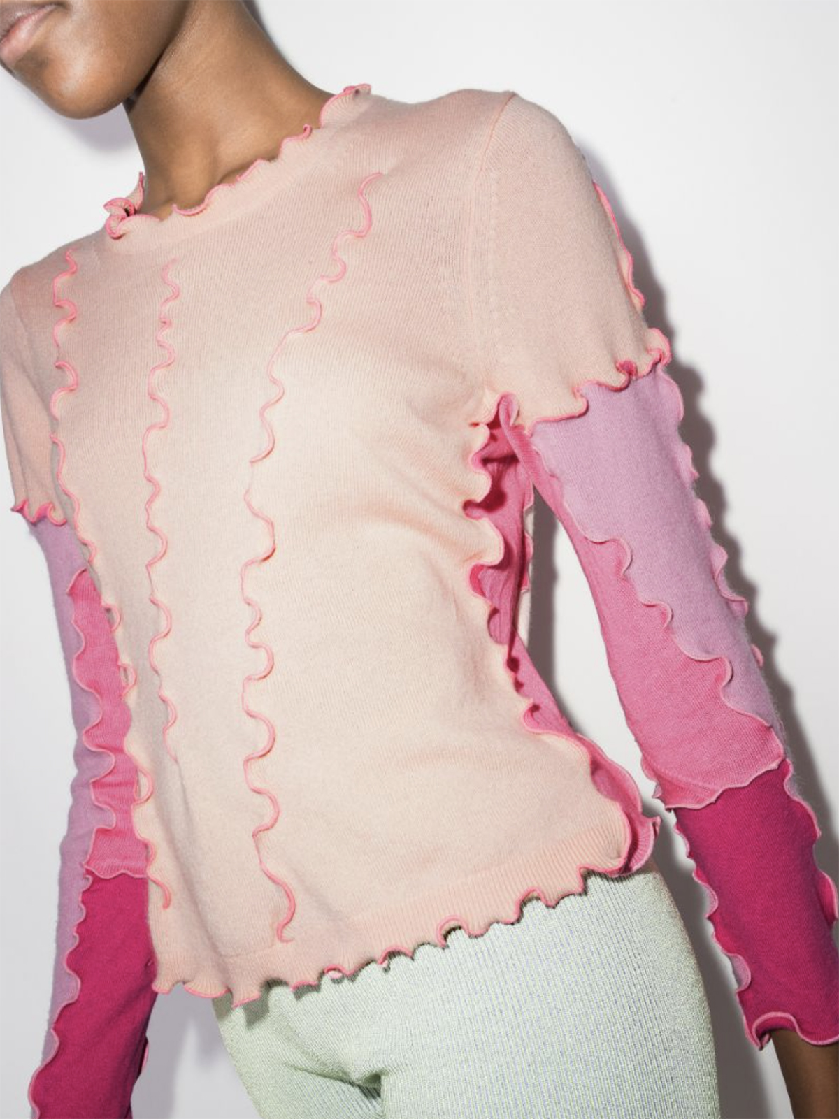 Ce pull rose à empiècements en sherris Hamziz est confectionné en coton et en laine et présente une coupe décontractée. Donnant l’illusion d’un t-shirt avec une sous-couche à manches longues, il est doté d’un col rond et de bordures contrastantes en laitue. La laitue est une plante annuelle de la famille des marguerites. Eh bien, oopsie daisy – ce pull sherris a réussi à apparaître dans notre panier.