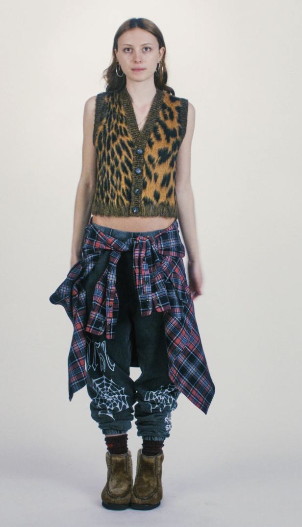 Le choix du motif léopard n’est pas anodin. Il symbolise la force et la liberté, des qualités que l’on retrouve chez celles et ceux qui osent l’adopter. En intégrant ce motif à une pièce aussi cosy qu’un gilet en mohair brossé, le contraste entre l’audace visuelle et le confort tactile crée une harmonie parfaite. C’est une pièce qui invite à l’exploration de son propre style, à l’affirmation de sa personnalité unique.