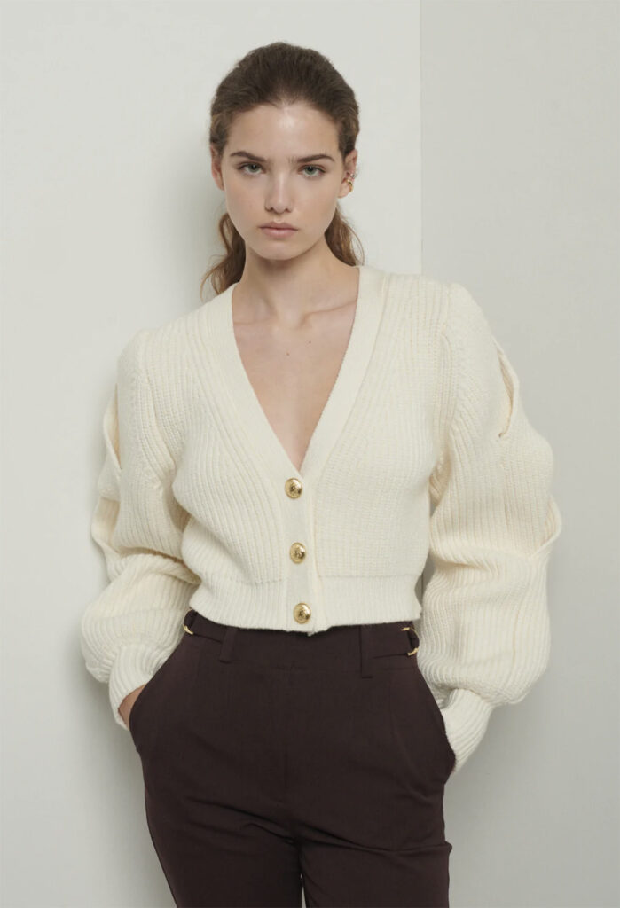 Le cardigan à manches torsadées Marcelyn réinvente la silhouette classique avec de nouveaux détails audacieux. Il est richement texturé et doux, confectionné à partir d’un mélange de coton côtelé bicolore. Il présente une encolure en V, trois boutons logo 10C argentés sur la patte de boutonnage avant et une torsade fantaisie le long de la manche qui donne l’illusion d’une tresse.