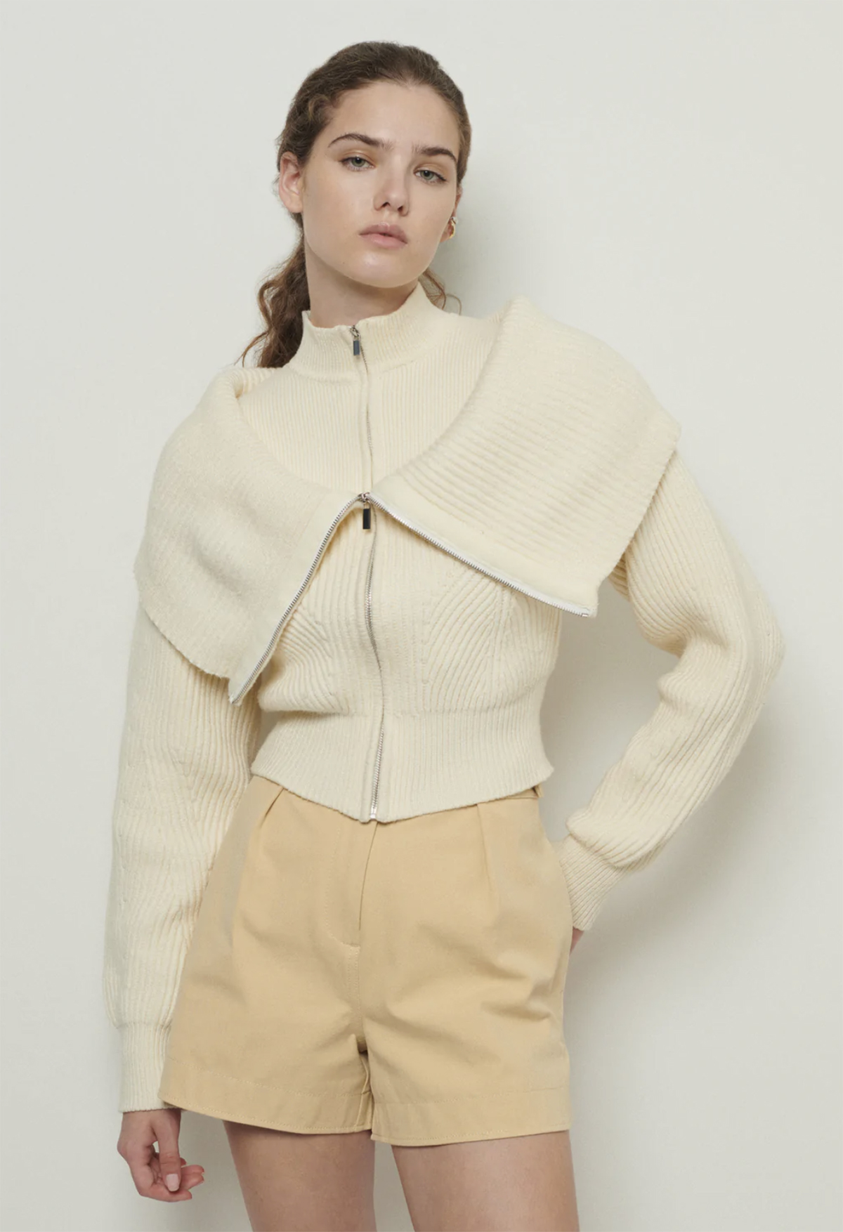Le cardigan à col ouvert à double épaisseur Ramona est tissé à partir d’un mélange de coton ivoire ultra doux et épais. Le pull pré-coiffé a l’effet de deux pulls en un. Il présente une encolure factice et un col roulé exagéré avec deux fermetures à glissière, des manches ballon et un motif de tricot sur le devant qui offre un design bustier subtil.