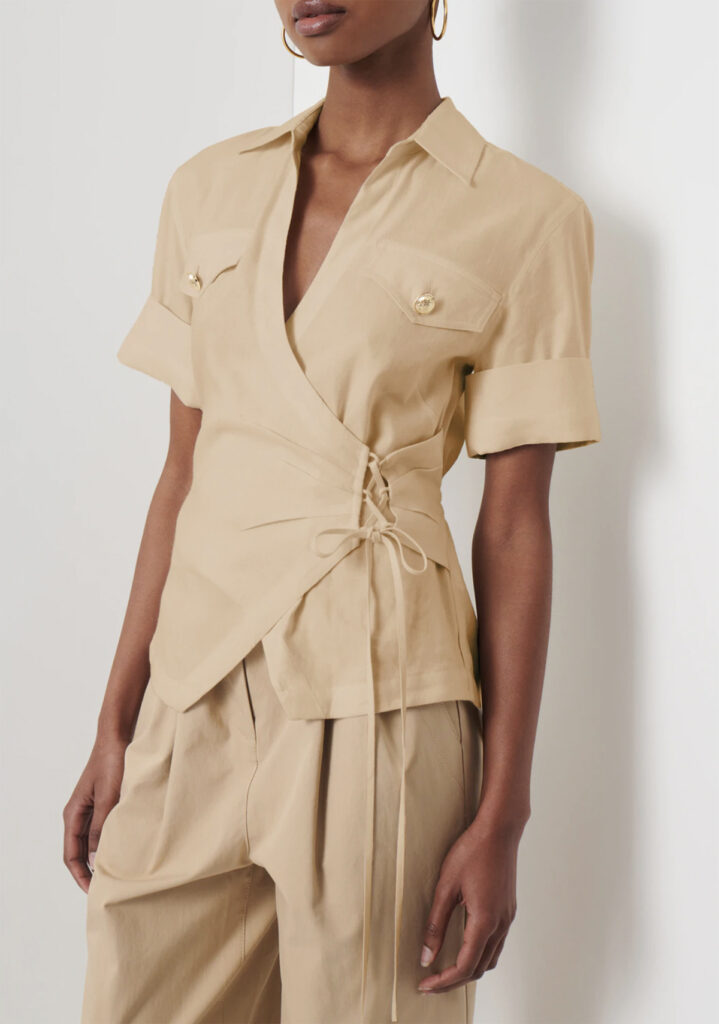 Le chemisier Tinley Tie Front Utility est confectionné dans un costume en lin stretch léger. La silhouette asymétrique présente un col italien classique, deux poches à rabat sur le devant avec des boutons dorés et des poignets roulés doux. Il est fini avec une fermeture portefeuille féminine fixée sur le côté avec un détail de laçage apparent. Donnez-lui du stylePantalon Sergiopour compléter le look.