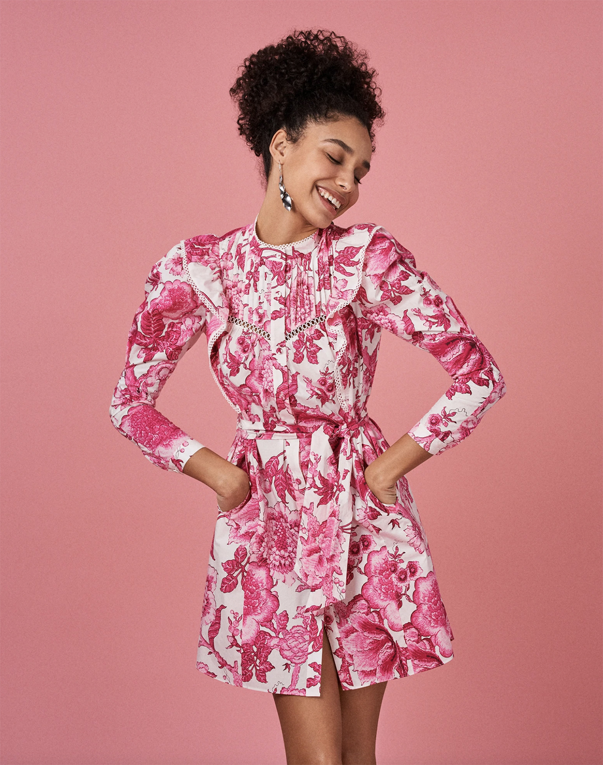 Robe ceinturée en popeline de coton. Clin d’œil aux détails vintage, cette pièce a un col montant avec des plis d’encolure et des épaules volantées avec des manches longues ajustées. Fermeture boutonnée avec une ceinture assortie, donnant au porteur la possibilité de le porter décontracté et sans forme ou cintré.