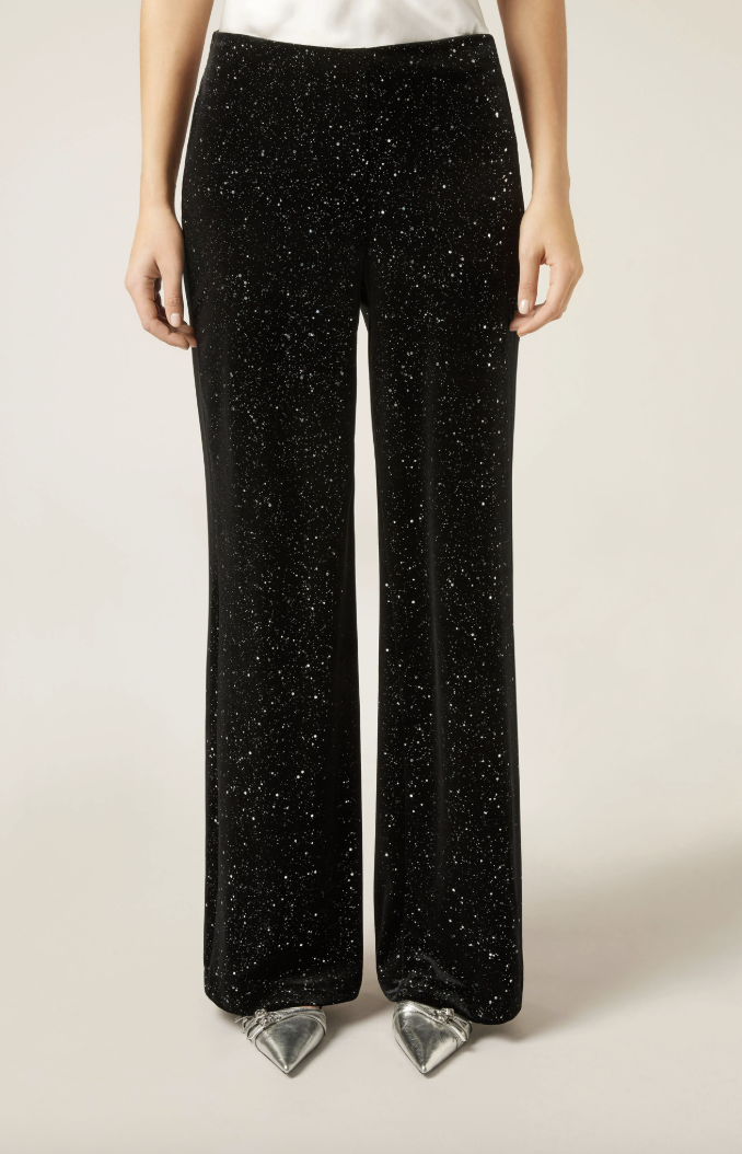 Le velours, déjà synonyme de luxe et de douceur, s’illumine désormais de scintillements grâce à des touches de paillettes intégrées dans le tissu. Ce mariage entre texture riche et éclat brillant transforme le pantalon palazzo en une pièce d’exception. Chaque mouvement devient une danse de lumière, captant les regards et élevant votre style à un niveau supérieur.