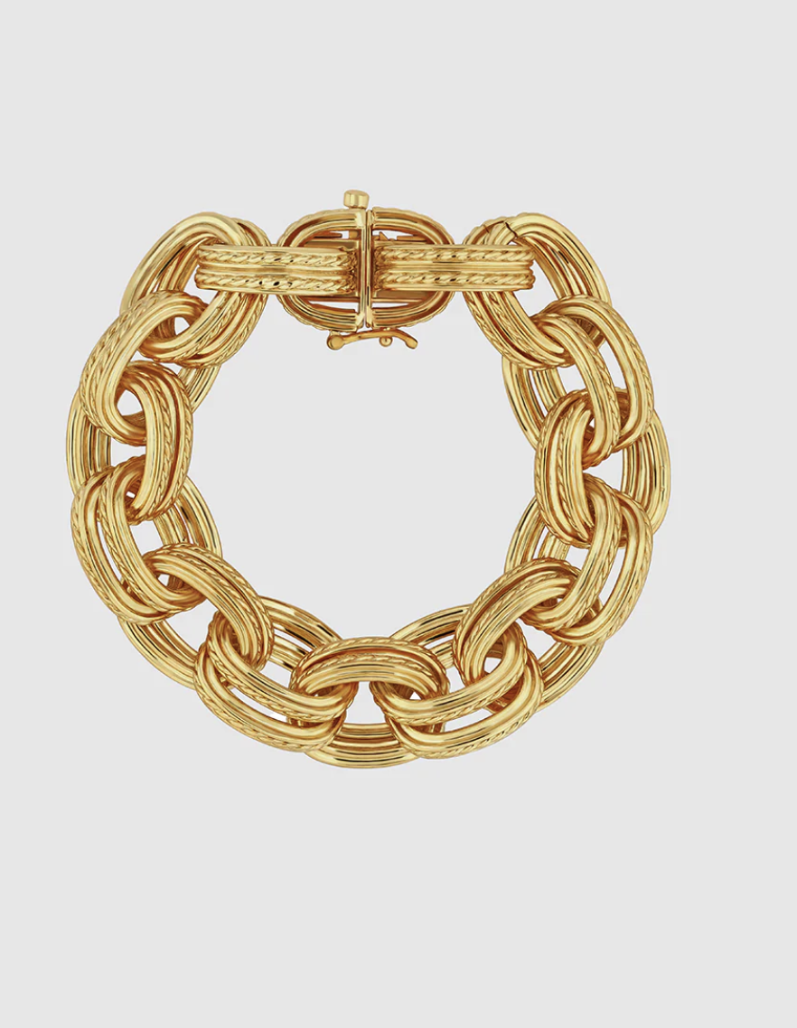 Les doubles maillons apportent une dimension dynamique au bracelet, créant un jeu subtil entre les éléments. Ils confèrent au bijou une texture unique qui capte l’œil et séduit l’esprit. Cette structure audacieuse mais harmonieuse rappelle la beauté complexe de la nature, où chaque élément joue un rôle dans l’ensemble. Avec "Élégance Dorée", le poignet devient une toile vivante, ornée d’un chef-d’œuvre de design.