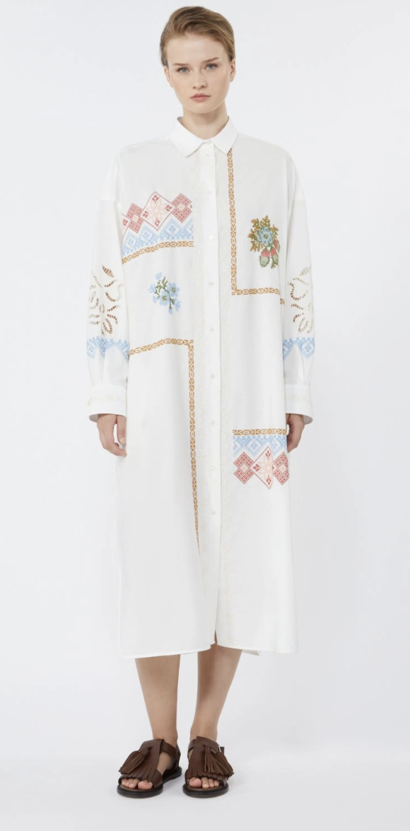 Mais au-delà de son esthétique, la robe-chemise brodée en popeline blanche est aussi une célébration de l’artisanat. La délicatesse de la broderie ajoute une dimension artistique à cette pièce simple, créant un équilibre parfait entre sobriété et sophistication. Chaque détail est soigneusement pensé, chaque fil est une note de musique dans une symphonie de style.