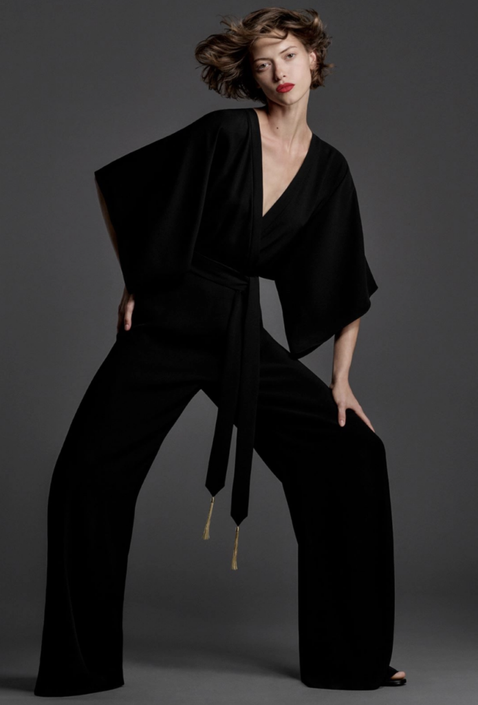 Enfin, briller dans une soirée ne dépend pas seulement de la tenue, mais aussi de l’attitude. La combinaison en cady noir encourage une posture élégante et un port de tête altier. Elle invite à se tenir droite et à rayonner de confiance, laissant transparaître une aura de mystère et de charme irrésistible. Avec cette tenue, chaque moment devient une occasion de briller sous les feux des projecteurs.