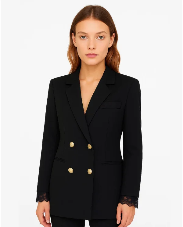 Les poignets en dentelle ajoutent une touche d’originalité et de féminité à la veste croisée. Ce détail délicat contraste avec la structure rigoureuse du vêtement, apportant une douceur inattendue. La dentelle, symbole de raffinement, évoque une élégance subtile qui séduit instantanément les amateurs de mode.