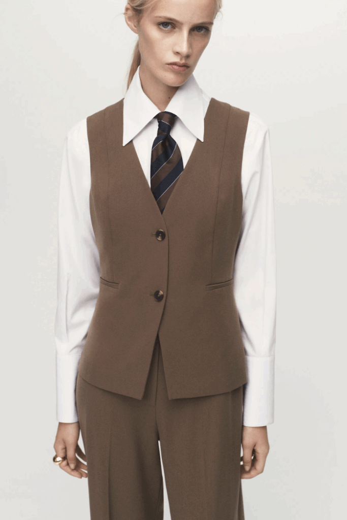 Élégance Sans Manches : L’Art du Tailleur Long en Marron