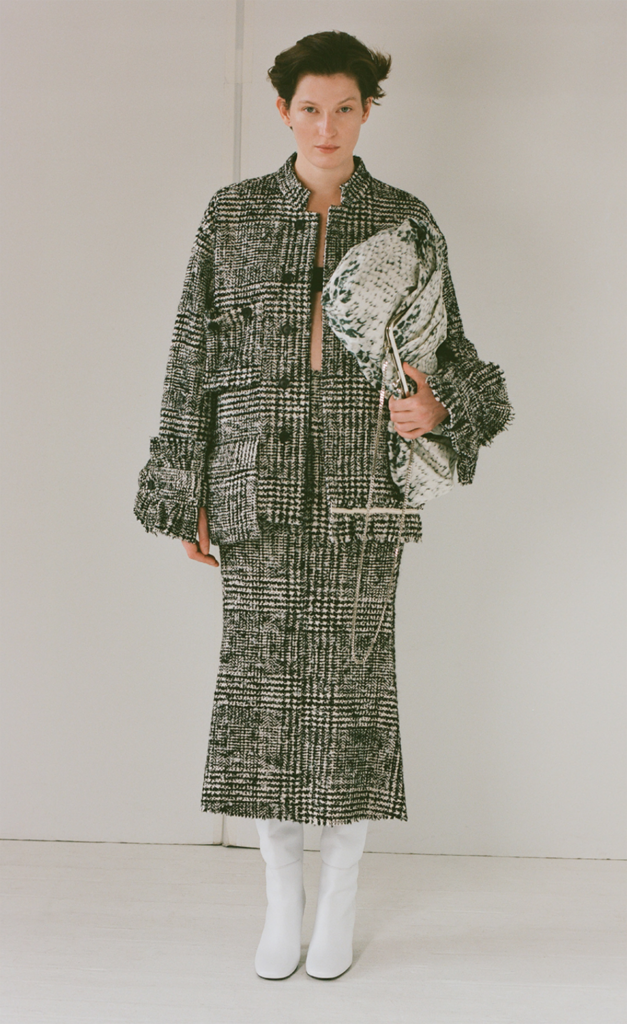 Jupe midi en laine bouclée noire et blanche. Volume sirène ajusté, ouverture au dos avec fermeture éclair cachée, poches à rabat et finitions ajourées.