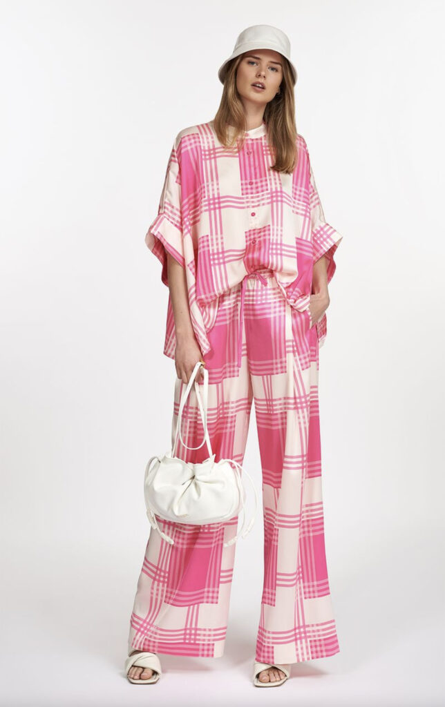Pantalon fluide réalisé dans une matière douce et respirante, dans un motif à carreaux. La silhouette aux jambes volumineuses et élégantes se combine tout aussi bien avec un simple top qu’avec la blouse assortie.