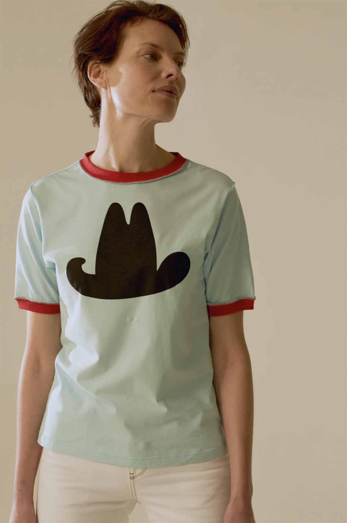 Ce t-shirt Cowboy Hat Ringer est confectionné en coton bleu clair léger dans une silhouette classique. Il est conçu avec des détails de sonnerie rouges à l’envers avec un chapeau de cow-boy sur le devant et « Au cœur du centre-ville » écrit à l’arrière.