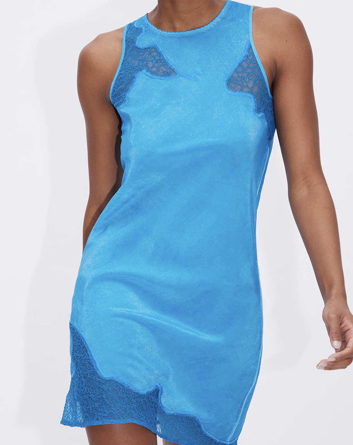 ‘Hailey’ est une mini-robe coupée en biais dans un tissu cupro double teinte avec des empiècements en dentelle asymétriques. Coupe trapèze sans manches et encolure ronde avec ouverture goutte d’eau dans le dos.