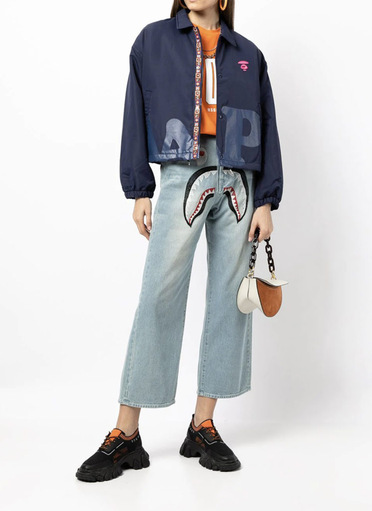 Patch logo sur l’arrière, détail dents de requin signature, passants de ceinture, fermeture à zip et boutons sur le devant, cinq poches classiques. Matière : coton.