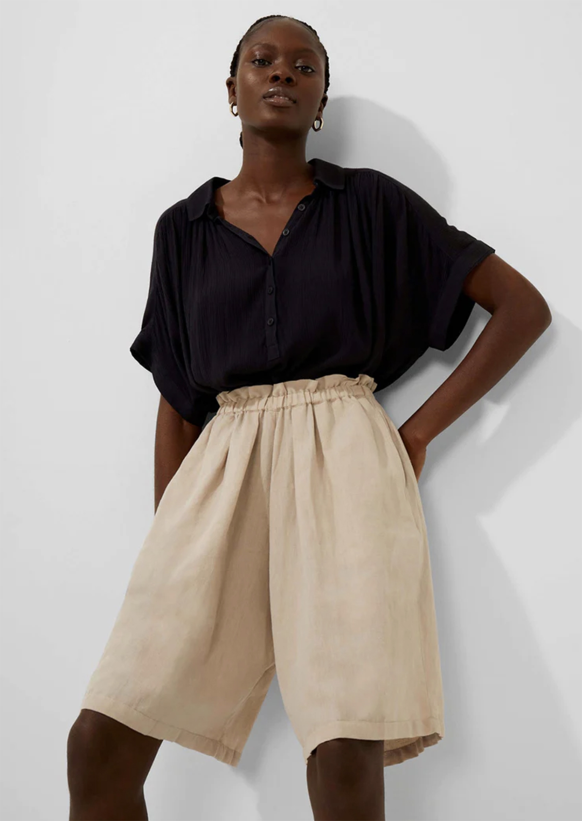 De la plage à la cabane dans le short en coton et lin Ahia. Il est équipé d’une ceinture élastiquée et de poches latérales. Tissu : mélange coton-lin, respirant, léger.