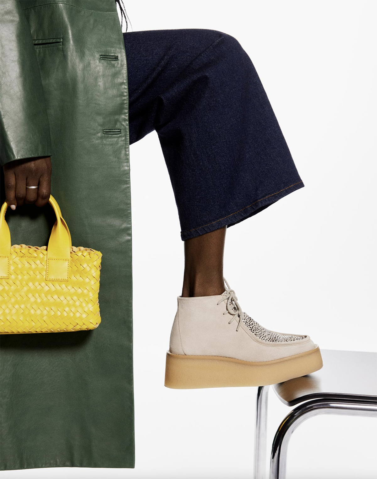 Bottines façon Wallabee en fourrure naturelle à imprimé pois gris avec lacets ajustables, semelles intérieures matelassées et semelle épaisse couleur caramel de 5,5 cm de haut.