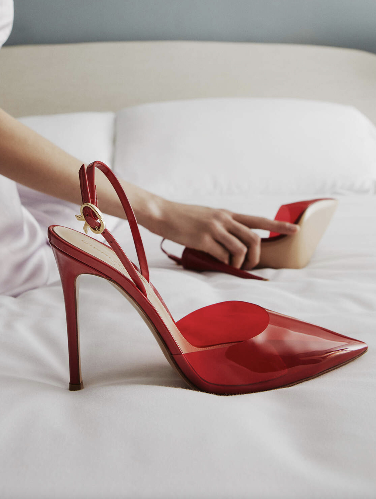 Des escarpins rouge vif à bout pointu en plexi et en cuir vernis avec bride arrière fine. Cette nouvelle création se caractérise par la boucle dorée en forme de ruban noué. Une décolleté extrêmement féminine et profondément séduisante. Hauteur du talon: 105