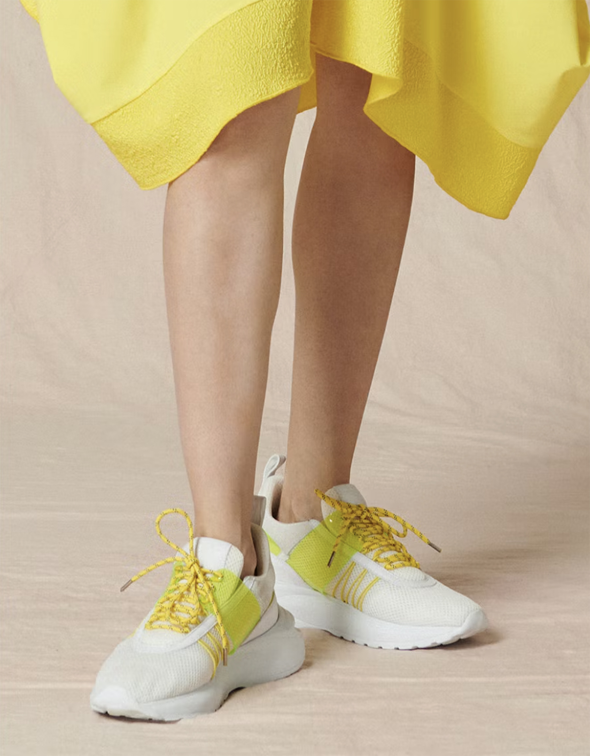 Sneaker high-tech avec semelle en coin formée en caoutchouc épais. L’empeigne devant est en réseau sportif technique ivoire. Renforcement talon en chameau gris clair. Lacée avec une petite corde « sport » jaune brillante avec des prestations élevées. Le ferme-lacets est une couche enroulante de plastique transparent jaune fluo et élastique jaune brillant. Passant sur le talon. Semelle tank.