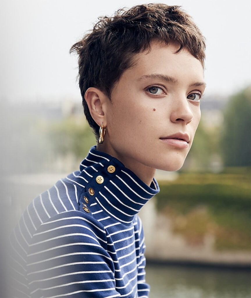 Un col roulé classique, super doux, parfait pour la superposition avec une touche : des boutons dorés sur le col pour plus de plaisir. 100% Coton.
