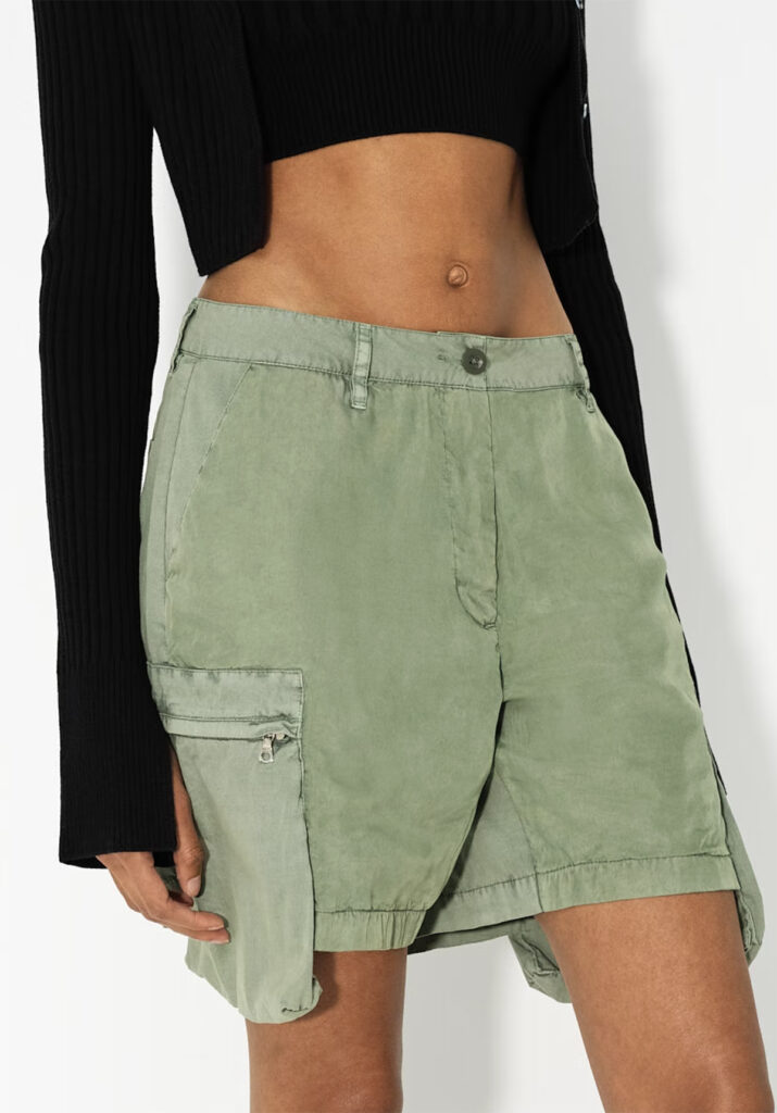 Short cargo coupe décontractée à taille basse avec poches cargo 3D en surplomb. Braguette zippée avec fermeture à bouton. Poches plaquées au dos. Fermetures éclair Riri sur les poches cargo. Teinture en pièce.