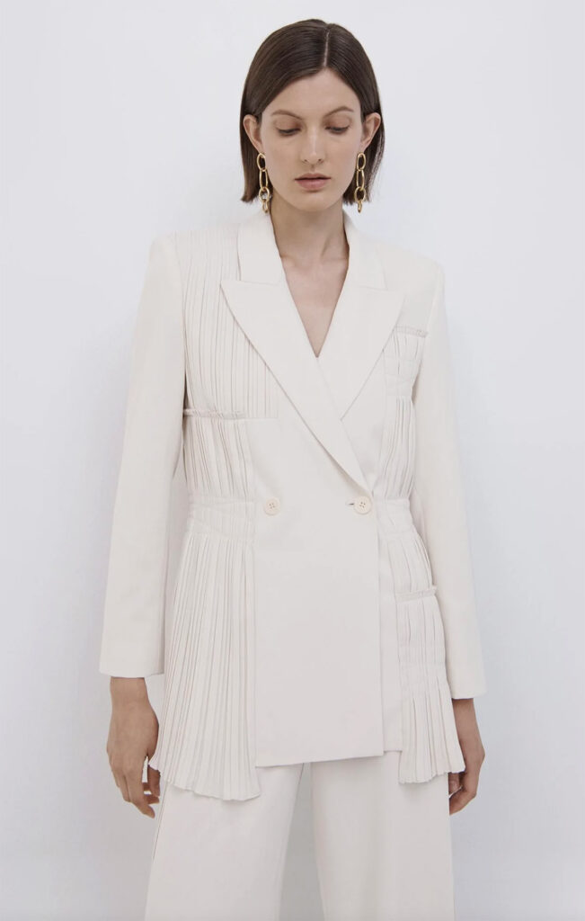 Le blazer plissé Lizzie en nougat. Élégant blazer à double boutonnage construit avec une silhouette structurée et une légère basque, orné de rubans élaborés de plis fluides.