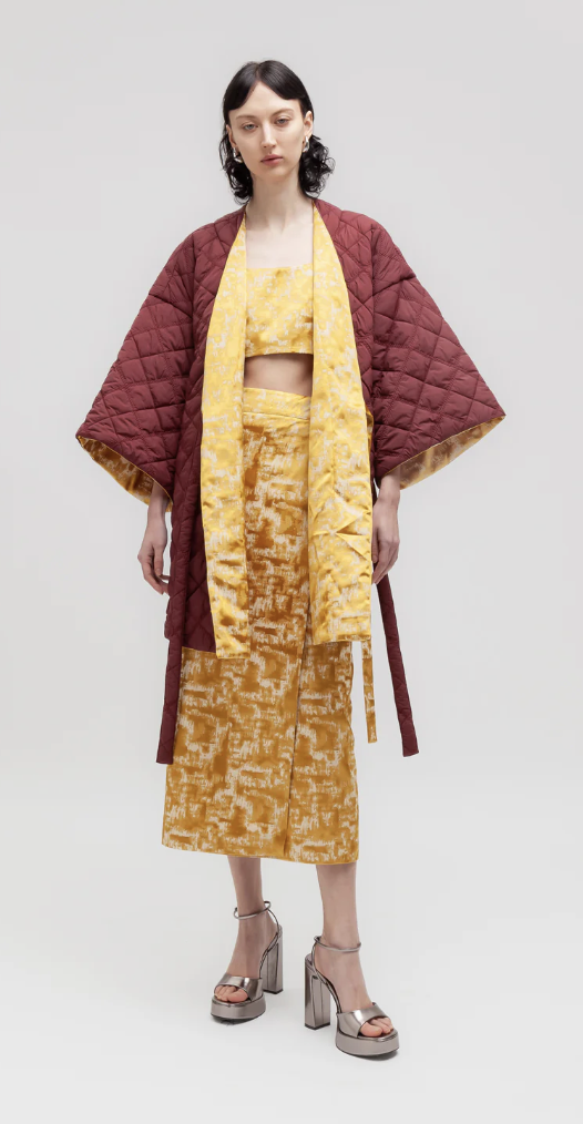 Ce choix de tissu n’est pas anodin. Il confère au Kimono-Bomber une dimension luxueuse et sophistiquée. En retournant votre veste pour révéler le brocart, vous optez pour une élégance discrète mais puissante, capable de captiver tous les regards. Chaque motif, chaque nuance devient une expression personnelle de style et de goût.