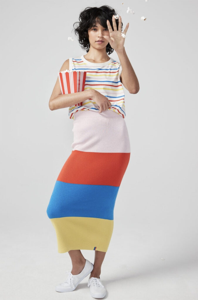 Présentation de la jupe color block Celeste. La jupe est légèrement extensible pour être facile à porter. C’est la jupe printanière pour mettre du ressort dans votre démarche. 100% Coton. 34″ de longueur.