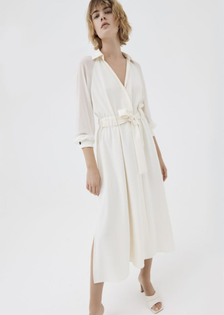 Robe chemise en satin Envers avec taille élastiquée et ceinture en tissu assortie. Col chemise à encolure en V, manches longues raglan à revers en georgette. Fermeture boutonnée dissimulée, fentes latérales à la base. L’article fait partie de la collection ART.365 Marella, des vêtements sans saison qui mettent l’accent sur la féminité et se mélangent facilement. Ces modèles iconiques se déclinent en deux coloris signature, noir et blanc, ou en version imprimée.