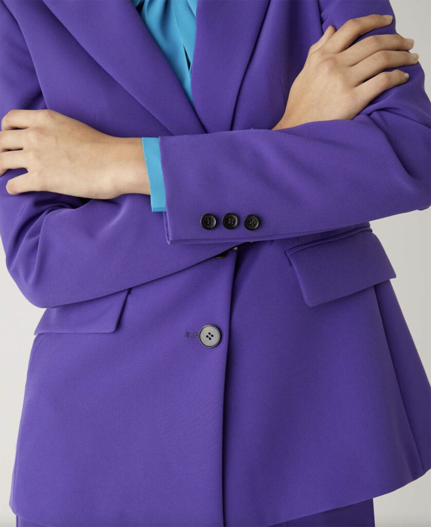 Blazer semi-ajusté en cady stretch. Col à revers et manches longues. Fermeture à boutons apparents et poches à rabat.