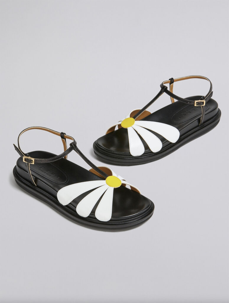 Sandales fussbett en cuir. Empeigne en forme de fleur. Bride de cheville en cuir avec boucle en métal doré. Semelle intérieure ergonomique. Semelle intermédiaire en caoutchouc Micro. Semelle extérieure en jute et caoutchouc. Fabriqué en Italie.