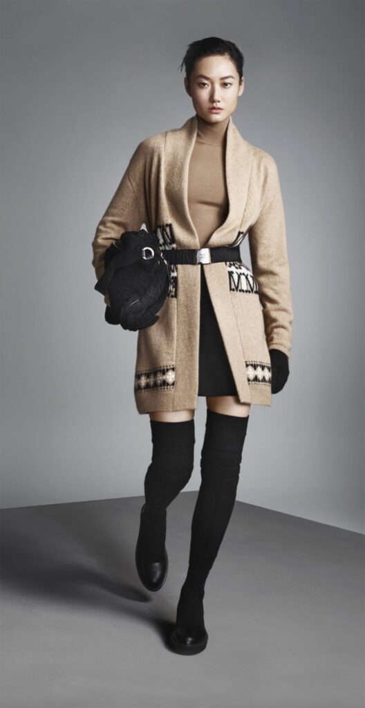 Cardigan long en fil de laine et chameau, travaillé avec un motif Monogram jacquard, avec col châle et manches longues. Fermeture façon peignoir avec ceinture assortie.