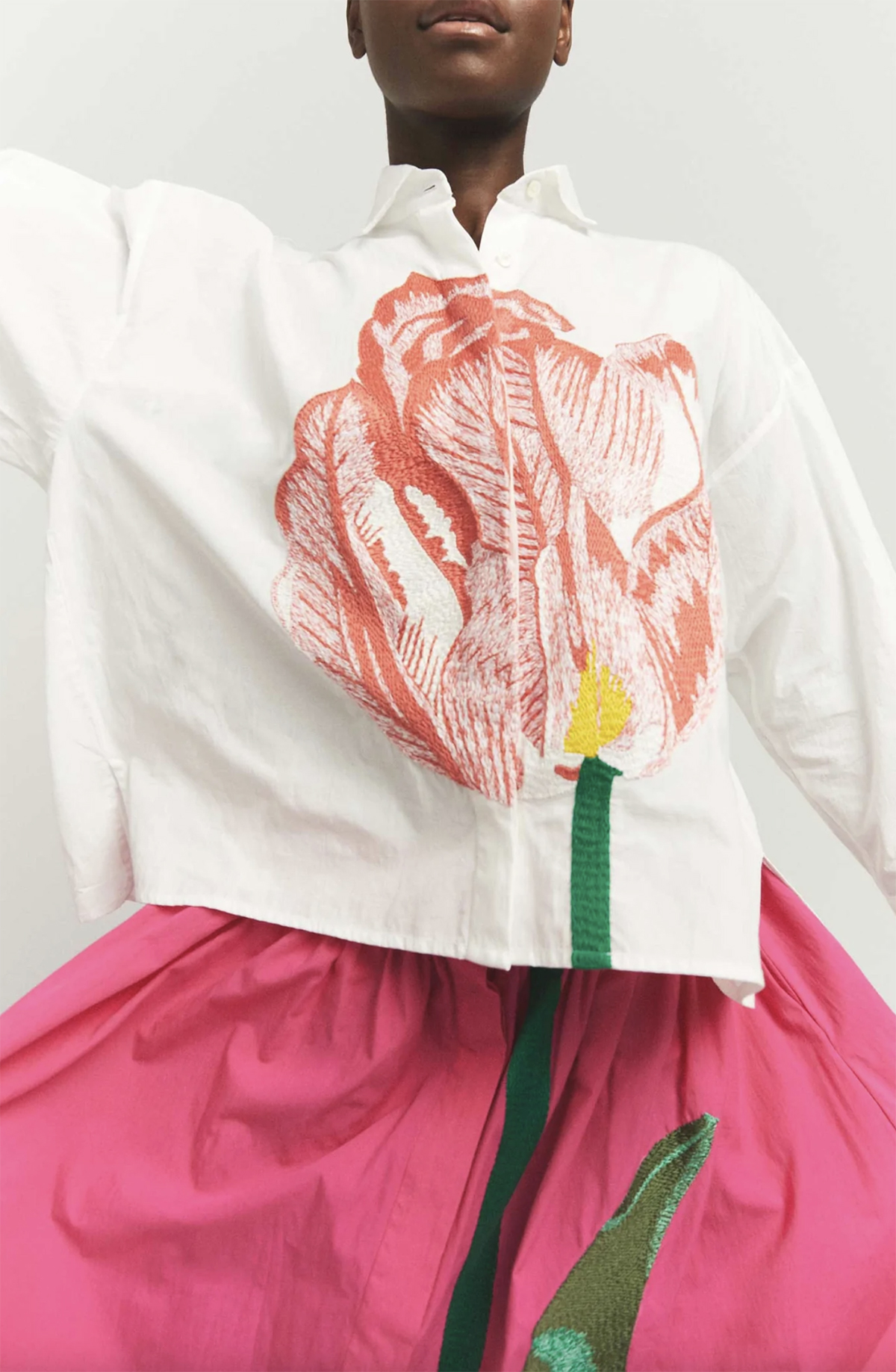La chemise Greta Tulipe est une pièce oversize en popeline de coton, rebrodée à la main grâce à la technique Aari d’une grande tulipe. Elle pourra s’associer à la jupe Mona brodée de sa tige.