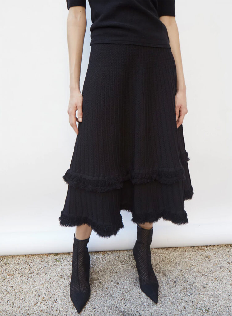 Cette jupe plutôt longue, tricotée en France dans une maille légère et stretch, se distingue par ses finitions frangées et mousseuses en fil de coton crêpé dans laquelle elle est réalisée.