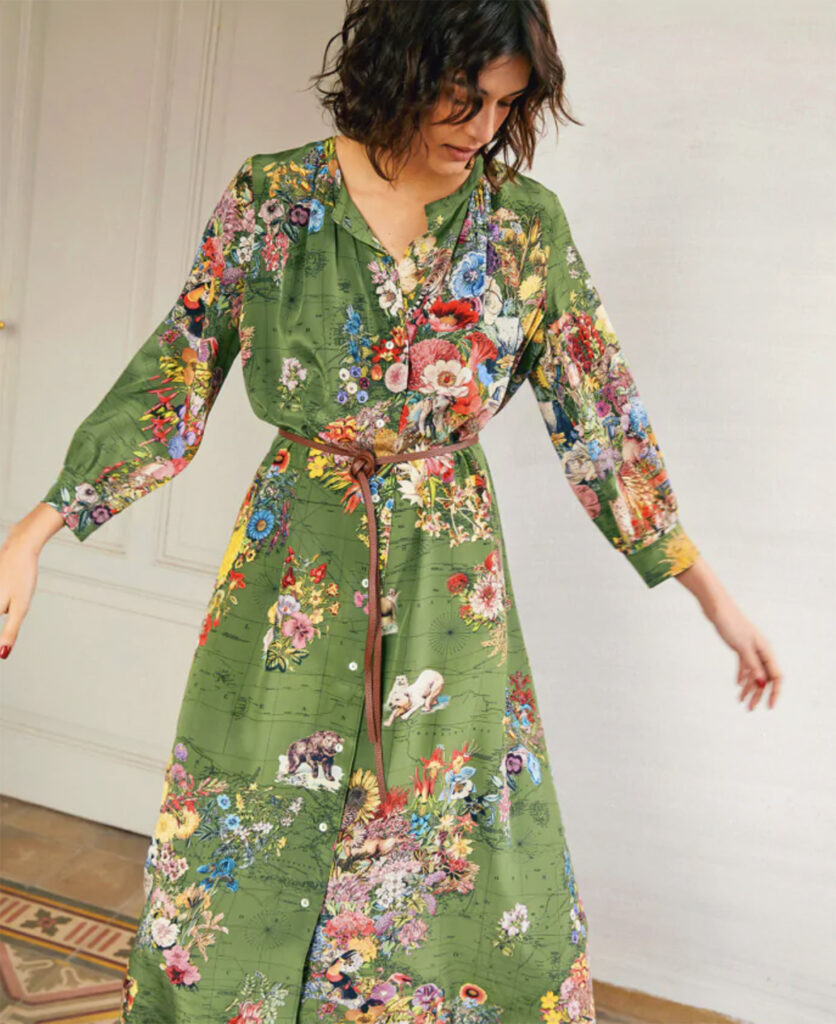 Robe chemise en crêpe de Chine pure soie imprimé. Décolleté en V ouvert. Fermeture boutonnée en nacre apparente et manches trois-quarts ballon. Parfait à porter également en cache-poussière.