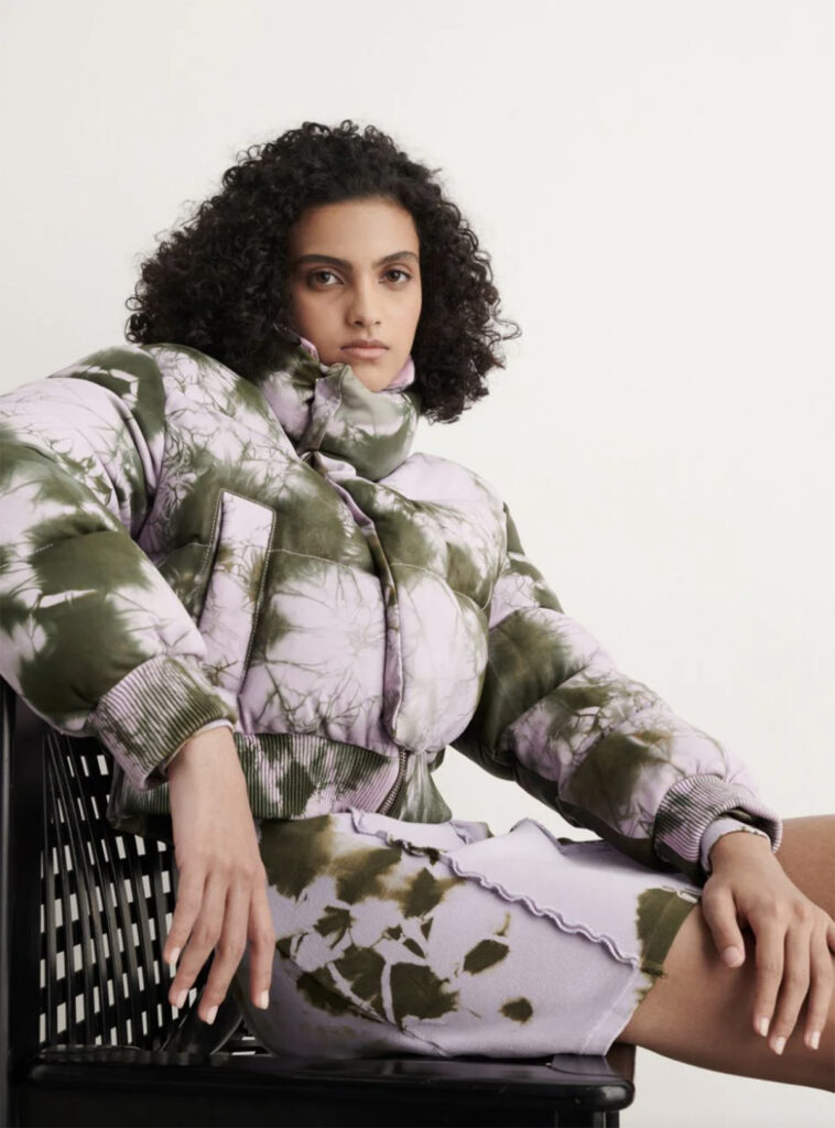 Doudoune courte tie-dye couleur lilas avec détails militaires sur toute la surface.Fermeture zippée sur le devant avec poches latérales.Col roulé.Ourlet côtelé.Flèche à l’arrière.