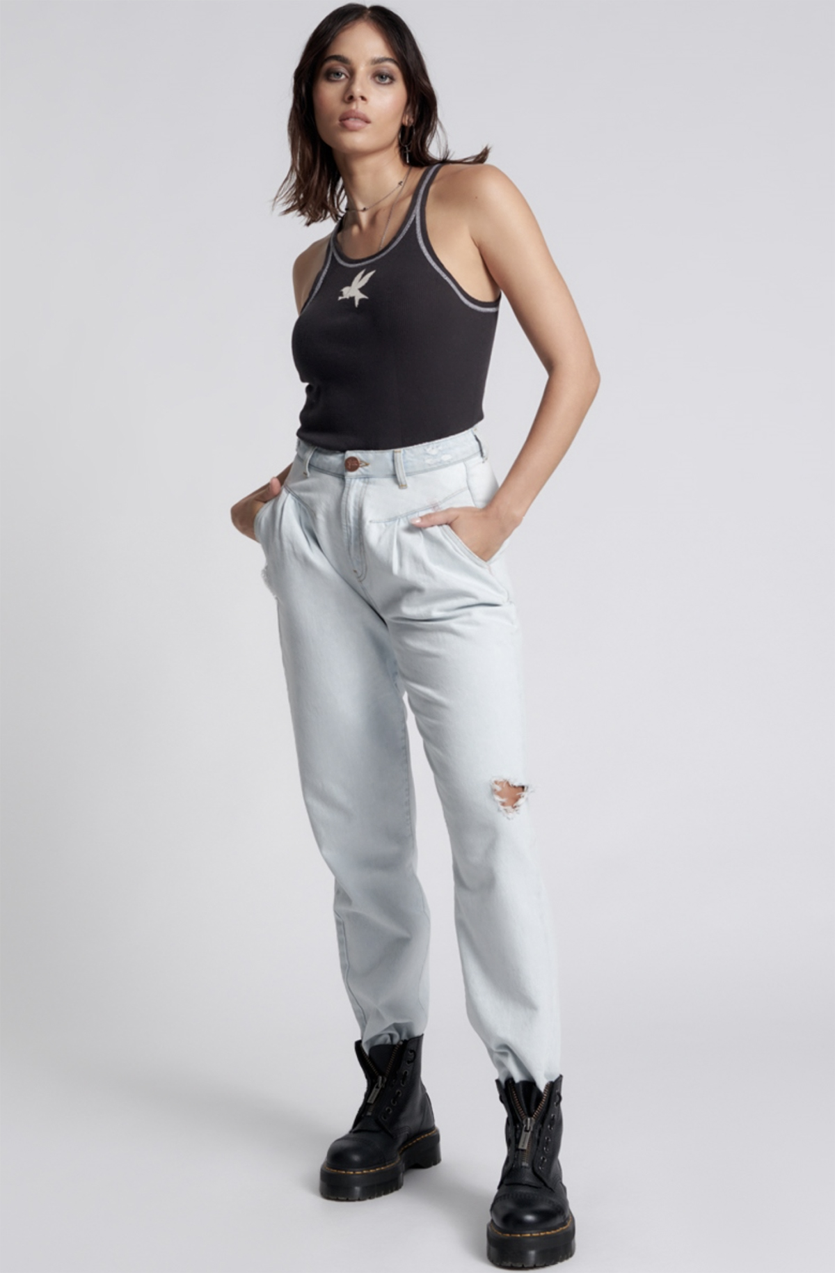 Jean taille haute d’inspiration vintage avec des détails sur mesure des années 80. Avec une couture d’empiècement avant inversée et des plis pour ajouter de la forme aux hanches. Coupe décontractée au niveau des cuisses et fuselée jusqu’à l’ourlet pour une coupe ajustée. Parfait habillé de haut en bas. A porter chic ou décontracté.