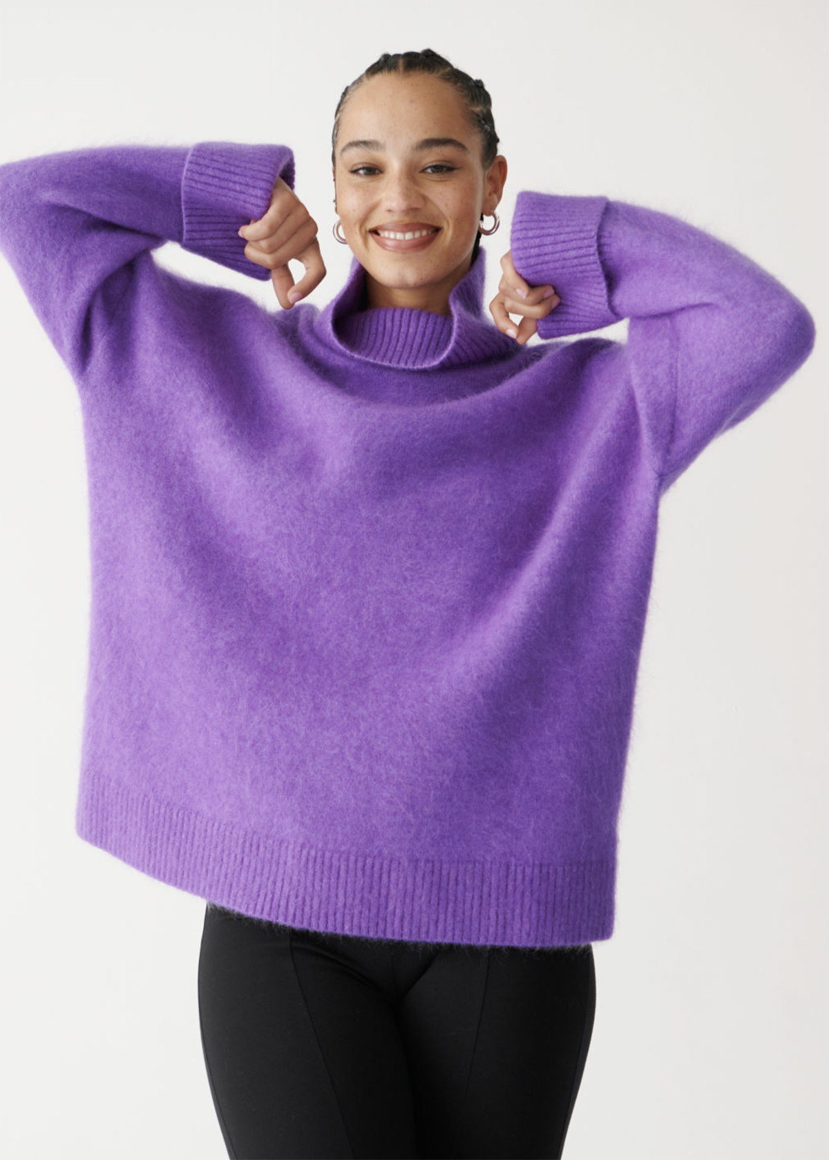 Pull oversize en maille au fini duveteux, col montant et poignets repliés.
